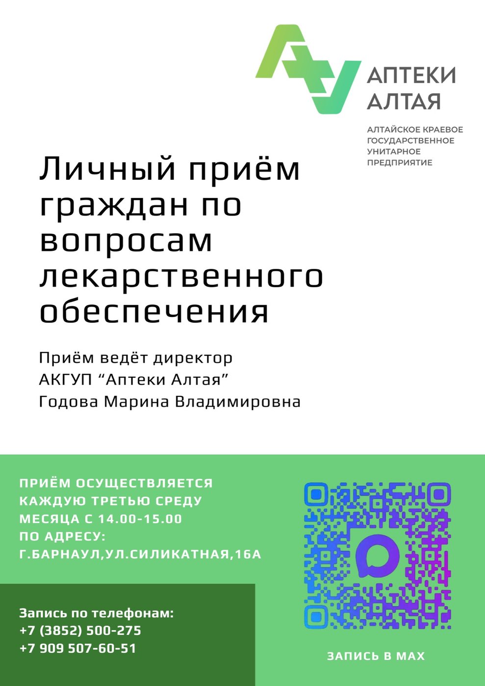 Уважаемые пациенты, с апреля 2026 г. ведётся запись на личный приём к директору АКГУП «Аптеки Алтая» - Годовой Марине Владимировне.